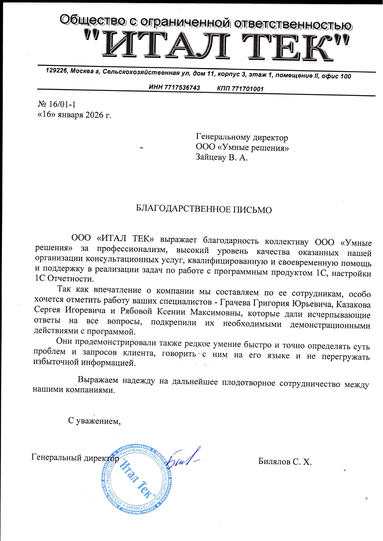 ООО «ИТАЛ ТЕК» ИНН 7717536743 выражает благодарность коллективу компании ООО «Умные решения» за высокий профессионализм, проявленный при автоматизации производственного процесса нашей организации.