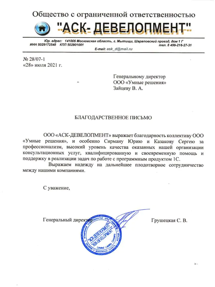 ООО «АСК-ДЕВЕЛОПМЕНТ» выражает благодарность коллективу ООО «Умные решения», и особенно Сирману Юрию и Казакову Сергею за профессионализм, высокий уровень качества оказанных нашей организации консультационных услуг, квалифицированную и своевременную помощь и поддержку в реализации задач по работе с программным продуктом 1С.